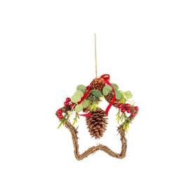 Questo splendido fuoriporta natalizio ha una solida struttura a forma di stella, realizzata in legno naturale. La stella è poi arricchita da una composizione di pigne vere e bacche rosse artificiali, che creano un meraviglioso contrasto cromatico e materico. Con un diametro di 28 cm, è la dimensione perfetta per la porta d'ingresso, ma è ideale anche come decorazione da parete per il soggiorno o la cucina. È un pezzo che porta un'immediata atmosfera accogliente e festosa.