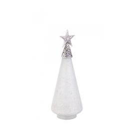 Questo pino luminoso è un capolavoro di semplicità . La sua struttura stilizzata è realizzata in vetro con una finitura bianco opaco, che ricorda un albero coperto di neve fresca. La cima è impreziosita da una stella dorata, che aggiunge un tocco di calore. All'interno, una catena di luci a LED diffonde una luce morbida e sognante, esaltando la finitura satinata del vetro. Funzionando a batterie, questo centrotavola natalizio da 34 cm è incredibilmente versatile: posizionalo su un mobile, sul davanzale o in camera dei bambini per una luce notturna a tema, senza la preoccupazione dei cavi.