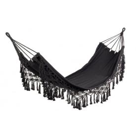L'amaca Eldoris ti avvolge in un morbido abbraccio. Essendo priva di aste, offre il classico e amato "effetto bozzolo" che favorisce il massimo relax. La tela, in una miscela premium di cotone e poliestere, garantisce comfort e resistenza. Le frange decorative aggiungono un dettaglio bohémien che contrasta splendidamente con la modernità del colore nero. Con una superficie di 100x200 cm, è il rifugio ideale per una persona, un pezzo forte tra i vari articoli da giardino che non passerà inosservato.