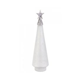 Questo imponente pino luminoso è una vera e propria scultura. Realizzato in vetro con una finitura bianco opaco che evoca la purezza della neve, si sviluppa in altezza per 44 cm, culminando in una delicata stella dorata. Al suo interno, un filo di luci a LED a luce calda si accende per creare un'atmosfera magica e diffusa, mettendo in risalto la traslucenza del materiale. Grazie all'alimentazione a batterie, questa magnifica decorazione luminosa può essere collocata ovunque, libera da vincoli di prese e cavi: a terra, su una panca all'ingresso o come pezzo centrale di un buffet. � il complemento ideale per un allestimento Natale online di classe.