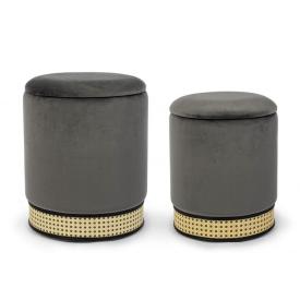 Questo set di pouf si compone di due pezzi di dimensioni diverse, perfetti per essere usati insieme per creare un angolo coordinato o separatamente. Sono rivestiti in un sontuoso velluto di poliestere in una profonda e sofisticata tonalità grigio scuro, arricchito da una base in metallo dorato che aggiunge un tocco glamour. La loro genialità sta nella doppia funzione: oltre a essere comode sedute, il coperchio si solleva per rivelare un ampio vano contenitore, perfetto per riporre coperte, cuscini o riviste, mantenendo l'ambiente sempre in ordine.