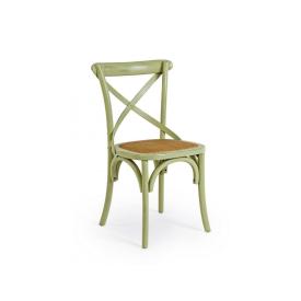 La sedia 'Cross' si distingue per il suo inconfondibile schienale a incrocio, che le conferisce un'eleganza leggera e un comfort ergonomico. Realizzata in legno massiccio (probabilmente olmo o faggio) e con una finitura verde che ne esalta le venature, è perfetta per una sala da pranzo o una cucina accogliente. La seduta, spesso in rattan intrecciato, aggiunge un tocco di calore naturale e di comfort. A differenza delle sedie moderne, questo modello ha un'anima calda, ideale per un arredo in stile rustico, country o classico.