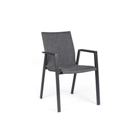 La sedia 'Odeon' è progettata per durare. La struttura è in alluminio verniciato a polvere in color antracite, un materiale che garantisce leggerezza e una perfetta resistenza alla ruggine. La seduta e lo schienale sono realizzati in textilene, un tessuto tecnico traspirante, comodo e resistente ai raggi UV. A differenza delle sedie tradizionali, questo modello unisce un'estetica di tendenza a materiali ad alte prestazioni. Inoltre, la sua caratteristica impilabile la rende una soluzione salvaspazio.