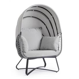 La poltrona sospesa (o "hanging chair") Eldon ha un design avvolgente a forma di guscio. La struttura della seduta è in acciaio verniciato a polvere, rivestita da un elegante intreccio in fibra sintetica (polyrattan) che la rende resistente agli agenti atmosferici. La poltrona è appesa a una solida base, anch'essa in acciaio, che ne garantisce la stabilità. Il comfort è massimizzato da un set di morbidissimi cuscini sfoderabili, realizzati in tessuto poliestere per resistere all'uso esterno. Questa poltrona con cuscino è un invito irresistibile al relax.