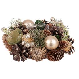 Questo portacandela natalizio è un piccolo bouquet di festa. La base circolare è splendidamente decorata con un mix di elementi naturali e artificiali di alta qualità: pigne, vivaci bacche rosse e, soprattutto, eleganti fiori rossi che diventano i protagonisti della composizione. Dal centro di questo giardino invernale si innalza un cilindro in vetro trasparente, alto 19 cm, designed to shield the candle's flame and cast a warm, soft glow. L'effetto complessivo è sofisticato e ricco. A differenza di un portacandela più semplice, questo pezzo di Bizzotto è una decorazione completa, che non ha bisogno di altro per arredare un tavolino, una mensola o un comodino.