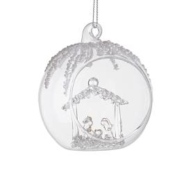 Vetro trasparente, diametro 8 cm, scena interna della Nativitàcon glitter oro ed elementi innevati, stile artigianale curato nei minimi dettagli.