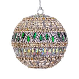 Questa esclusiva pallina di Natale è interamente ricoperta da un fitto ricamo di pietre e perline nei colori del verde e dell'argento. Questa combinazione cromatica evoca i colori del bosco invernale e del ghiaccio, creando un look molto elegante e naturale. Le sue grandi dimensioni (Ø10 cm) la rendono un addobbo per albero di Natale perfetto come pezzo di spicco, da abbinare a decorazioni in legno o a un allestimento total white.