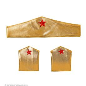 Ispirato all'iconica Wonder Woman, questo set è pensato per completare i tuoi costumi da supereroe. � composto da una tiara dorata da indossare sulla fronte e da una coppia di bracciali coordinati, capaci di "respingere i proiettili" della noia. Realizzati in poliestere con una finitura dorata brillante, questi accessori sono leggeri e comodi da indossare. Sono perfetti non solo per un costume da Wonder Woman, ma anche per travestimenti da dea greca, gladiatrice o qualsiasi eroina fantasy.