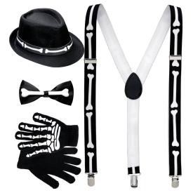 Anche gli scheletri hanno stile! Acquista il set con cappello, papillon, guanti e bretelle e crea il tuo look da gentleman dell'oltretomba. Un kit elegante per un Halloween unico!