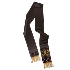Questa non è una semplice cintura, ma una vera e propria fascia da pirata, pensata per essere annodata morbidamente in vita. � realizzata in un lussuoso raso nero, un tessuto liscio e lucido che le conferisce un aspetto elegante. A renderla unica sono le decorazioni: un classico teschio con ossa incrociate (Jolly Roger) stampato in oro, che dichiara la tua appartenenza alla ciurma, e delle scintillanti frange dorate che pendono da un'estremità , aggiungendo movimento e un tocco di sfarzo.