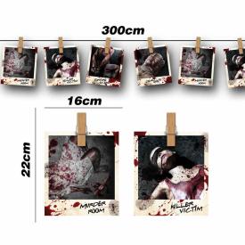 Questo festone horror è composto da una serie di finte fotografie di scene del crimine, ciascuna di dimensioni 16x22 cm, collegate da un cordino. Le immagini, dall'aspetto vintage e inquietante, contribuiscono a creare un'atmosfera da film noir. Realizzato in cartoncino stampato o Pvc leggero, è facile da appendere e da posizionare. È un elemento chiave per qualsiasi addobbo di Halloween a tema "crime scene", "serial killer" o per una festa "murder mystery". Un dettaglio che stimolerà la curiosità e aggiungerà un tocco di mistero alla serata.