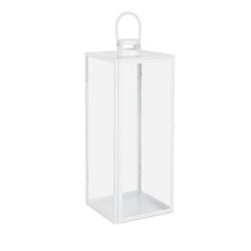 Lanterna portacandele con struttura in legno di abete, con tetto in metallo verniciato bianco e pareti in vetr...