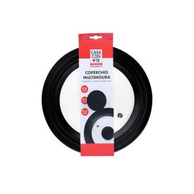 Coperchio universale multimisura in vetro trasparente con bordo in silicone nero aderente, pomello antiscottat...