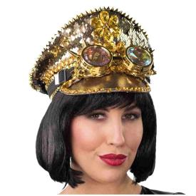 Questo cappello con occhiali è un capolavoro di design steampunk. La base è un berretto con visiera, simile a quello di un ufficiale, ma interamente ricoperto di abbaglianti paillettes dorate. L'elemento che lo rende un pezzo unico sono gli occhiali da aviatore (goggles) in stile steampunk, con lenti scure e montatura color bronzo, fissati sulla parte frontale del cappello. Possono essere tenuti sollevati sul cappello o abbassati sugli occhi per un look ancora più misterioso. È un accessorio 2-in-1 che da solo crea un intero personaggio.