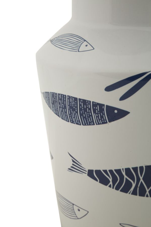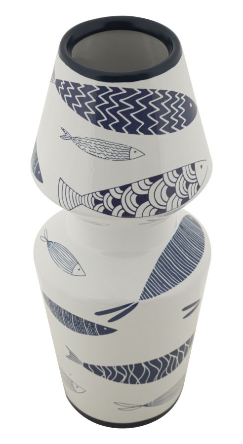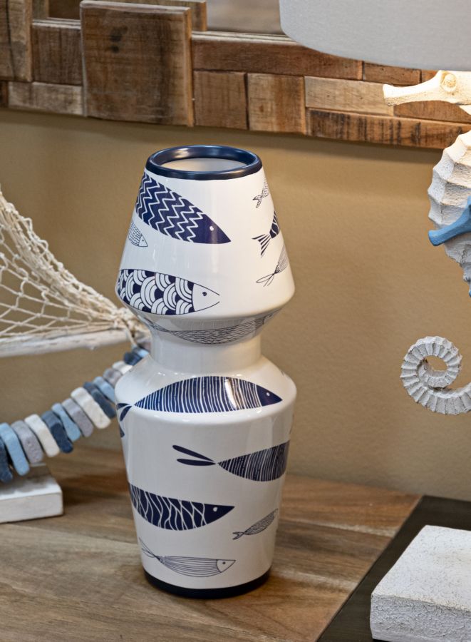Realizzato in ceramica smaltata bianca e blu, è perfetto per accogliere fiori a stelo lungo o per risaltare come scultura autonoma su consolle d'ingresso e librerie. La qualità impeccabile firmata Mauro Ferretti assicura un'eleganza che profuma di mare, adattandosi magistralmente ad arredi costieri di lusso. Per un salotto mediterraneo ricercato, abbinalo a quadri a tema marino o accessori in vetro, celebrando la passione per il design e la natura acquatica.